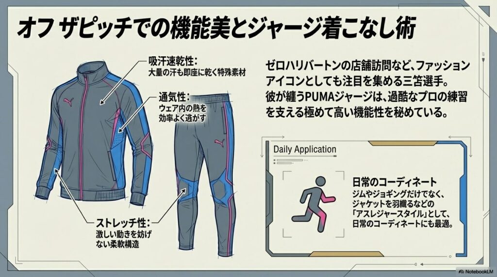 そうした場面で彼がスマートに着こなしているプーマのジャージは、スポーティーでありながらどこか洗練された雰囲気を漂わせています。