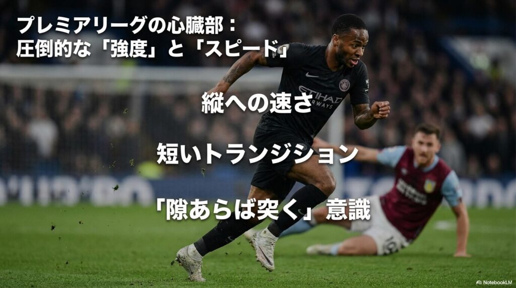 プレミアリーグ最大の特徴は、何と言ってもその「スピード」と「インテンシティ(強度)」です。他国のリーグと比べても、以下のような違いが明確です。