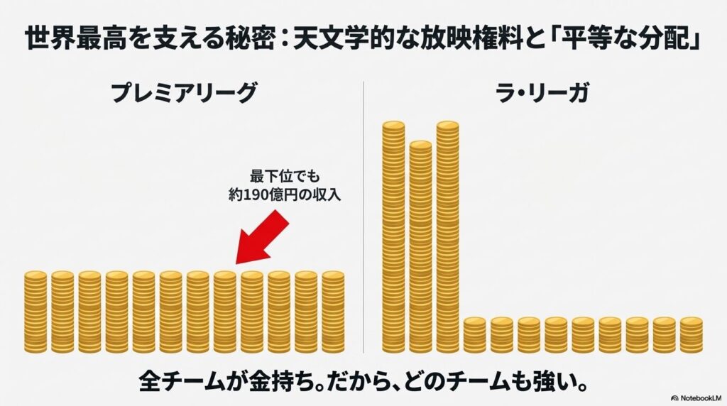 プレミアリーグの放映権料は、総額で約2兆5000億円という天文学的な数字に達しています。特にすごいのが、その「分配の平等性」です。