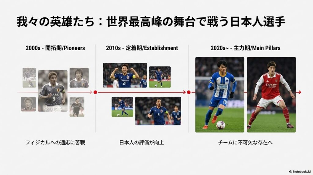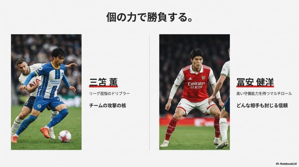 現在では、ブライトンの三笘薫選手がリーグ屈指のドリブラーとして、アーセナルの冨安健洋選手が高い守備能力を持つマルチロールとして、世界中から認知されました。