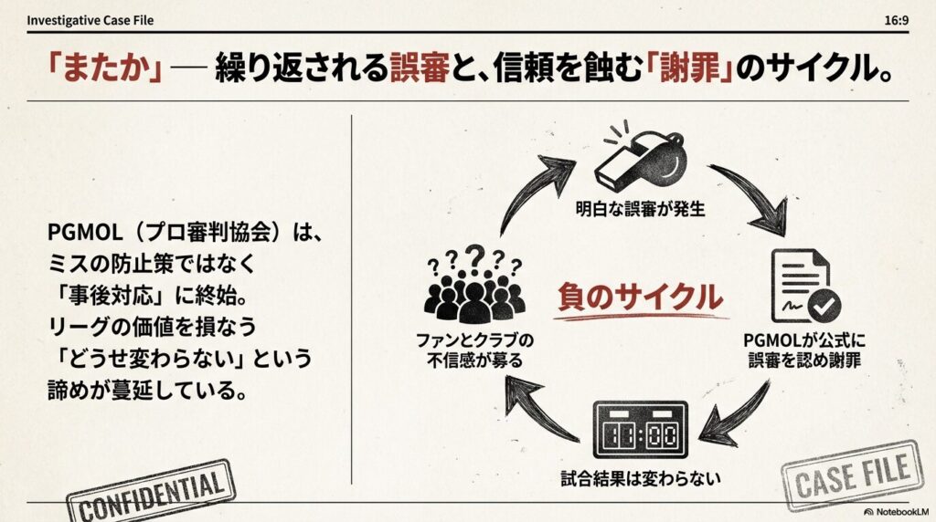 - プレミアリーグではPGMOLの構造的問題により誤審と謝罪が繰り返されている。