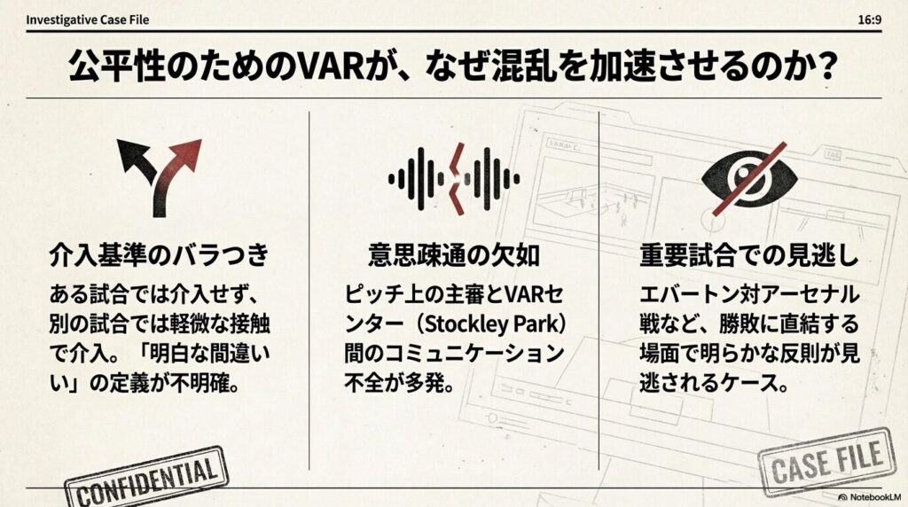 ある試合では「明白な間違い」のハードルが高く介入しないのに、別の試合では軽微な接触で介入する。 - 意思疎通の欠如