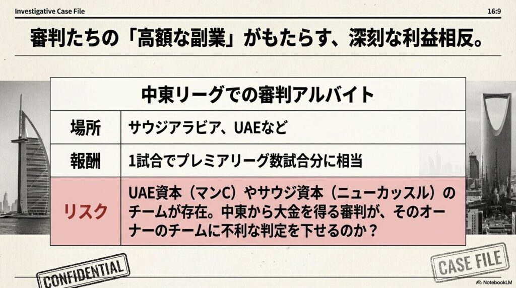 もう一つの大きな問題は、プレミアリーグの審判員が中東リーグで高額な「アルバイト」を行っている点です。