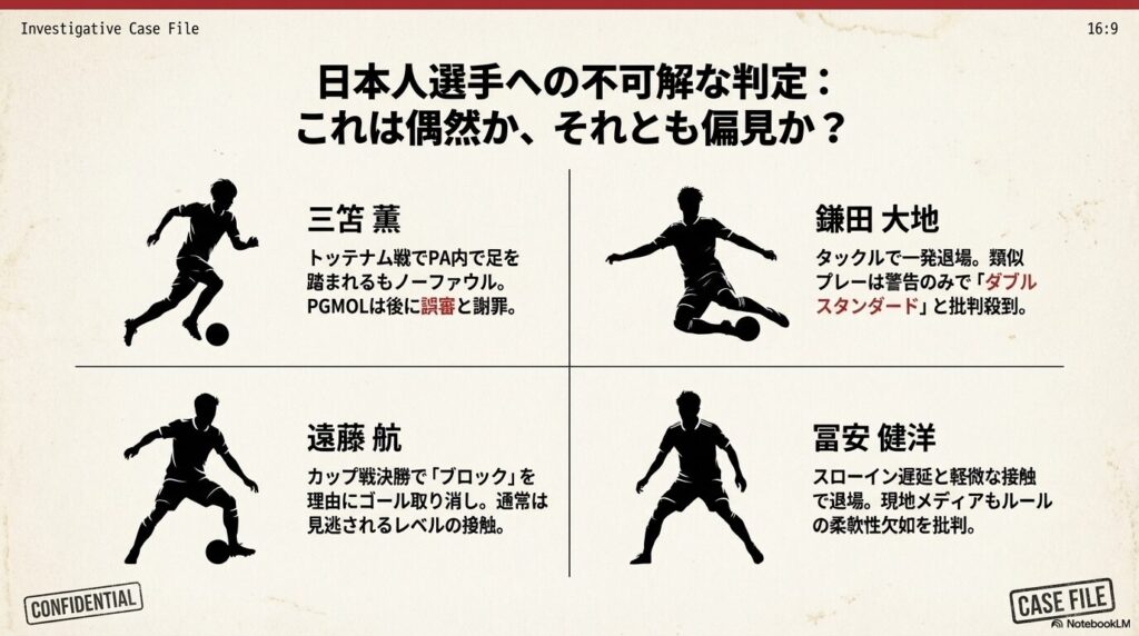 - 三笘薫選手ら日本人選手への判定には、不可解な厳しさや偏りが見られる。