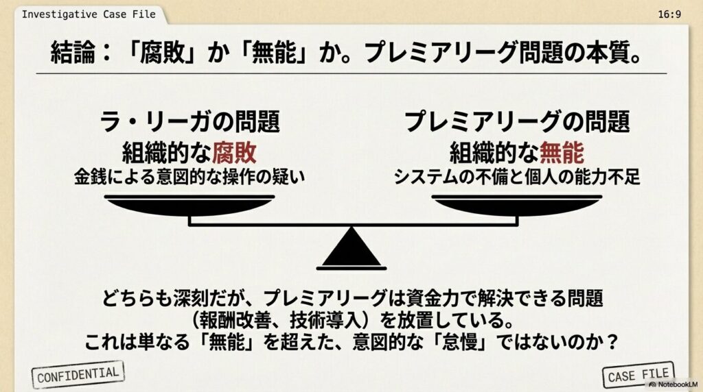 どちらも深刻ですが、プレミアリーグの場合は資金力を生かして解決できるはずの問題(報酬アップや技術導入)を放置している点で、よりタチが悪いとも言えます。