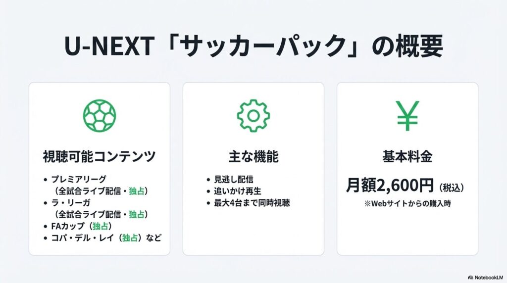 | 契約内容 | U-NEXT (基本プラン) | 「サッカーパック」 単体で契約 | U-NEXT(月額プラン)と 「サッカーパック」を契約 |