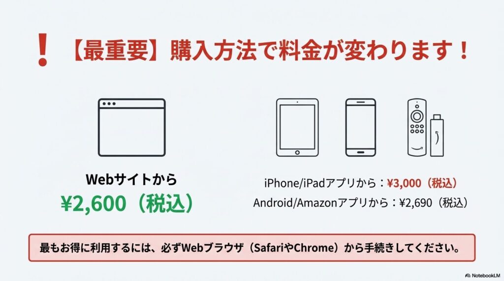上の章でも説明しましたが、各デバイスからの購入方法によって月額料金に違いがあります。