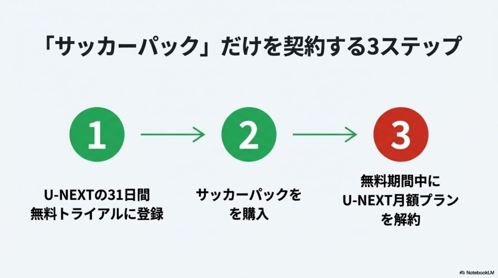 新規ユーザーは無料トライアルを利用でき、無料トライアル期間中にU-NEXT月額プランを利用停止することで、「サッカーパック」だけを利用できるようになります。