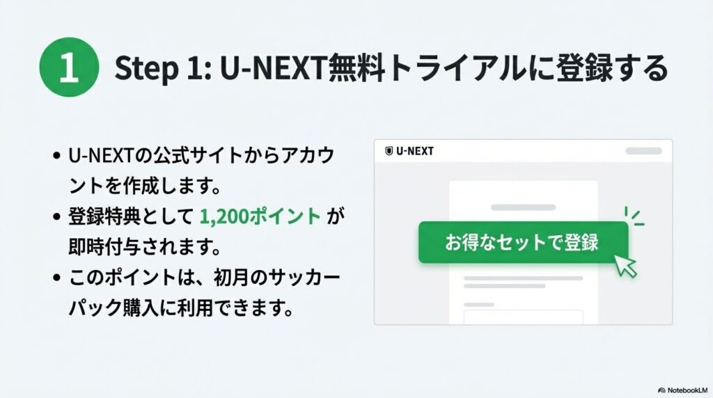 | 会員登録 | ・U-NEXT会員登録(有料or無料) ・月額追加コンテンツ「U-NEXT サッカーパック」を購入 |