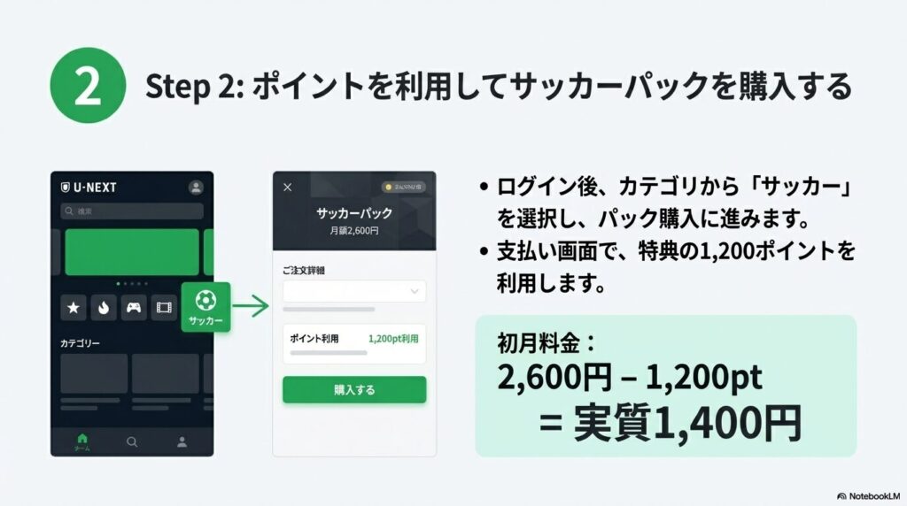1,200ポイントを全て活用することで、月額2,600円(税込)のU-NEXT サッカーパックを実質1,400円(税込)で購入できるようになります。