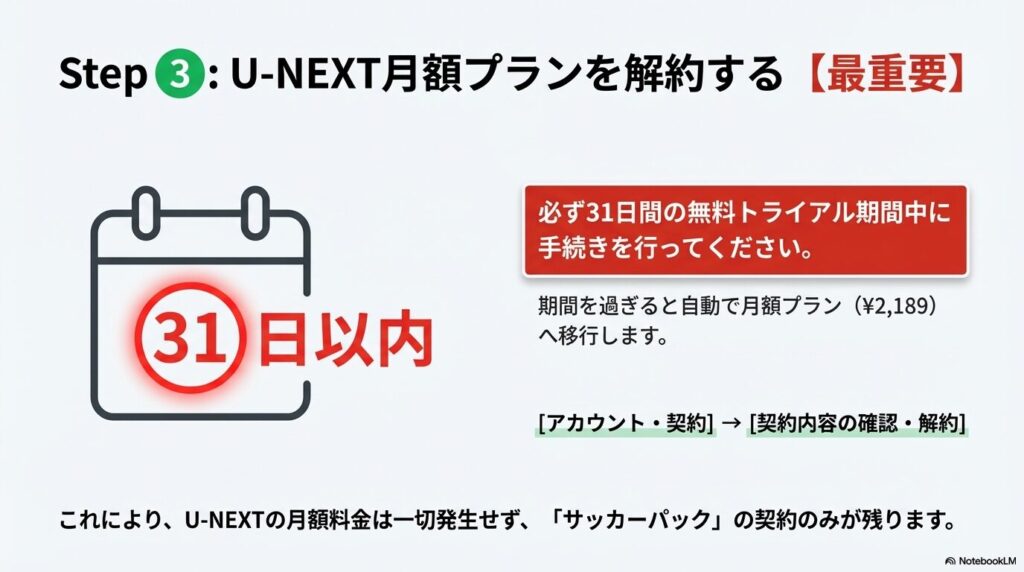 これで、U-NEXTの月額料金2,189円(税込)を払わずに、「サッカーパック」だけを契約したかたちとなります。